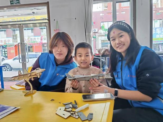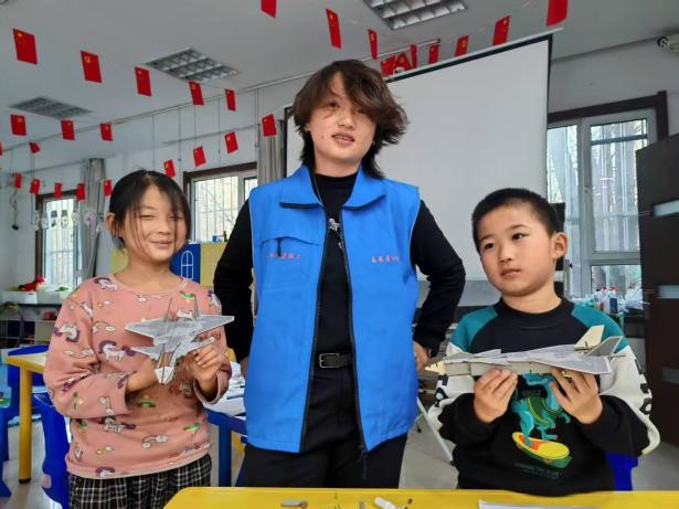 返回教室后,动手实践环节温馨开启。宣讲团成员们提前备好材料包,手把手指导孩子们制作飞机模型。剪裁、折叠、组装,孩子们专注投入,遇到难题时互相请教、分工协作:有的帮忙传递工具,有的分享组装技巧,在互帮互助中深刻体会“大力协同”的精神内涵。每一个亲手完成的模型,都承载着孩子们的专注与满满的成就感。