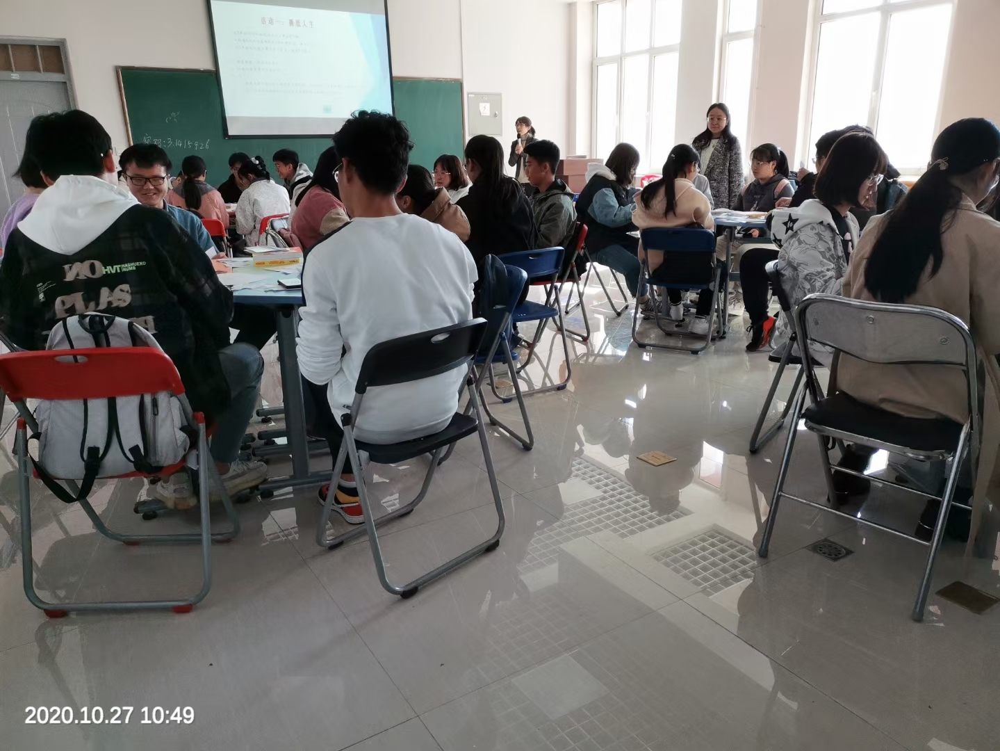王萍老师对同学们进行了分组,组织同学们一起做了热身游戏,通过热身游戏,同学们更加深入的了解了本组组员,并积极投入活动之中。王萍老师通过感悟生命、珍惜生命和敬畏生命三部分内容进行团体辅导,让学生思考生命的价值,疫情之下作为新时代大学生的责任和担当是什么。撕纸游戏中,各小组同学展开热烈讨论,面对越来越少的时间,大家纷纷表示要珍惜时间,以只争朝夕,不负韶华的精神刻苦学习专业知识,发挥生命最大价值。在最后的敬畏生命环节,各小组通过绘制图画,表达了生命平等,珍惜生命从而敬畏生命的主题。