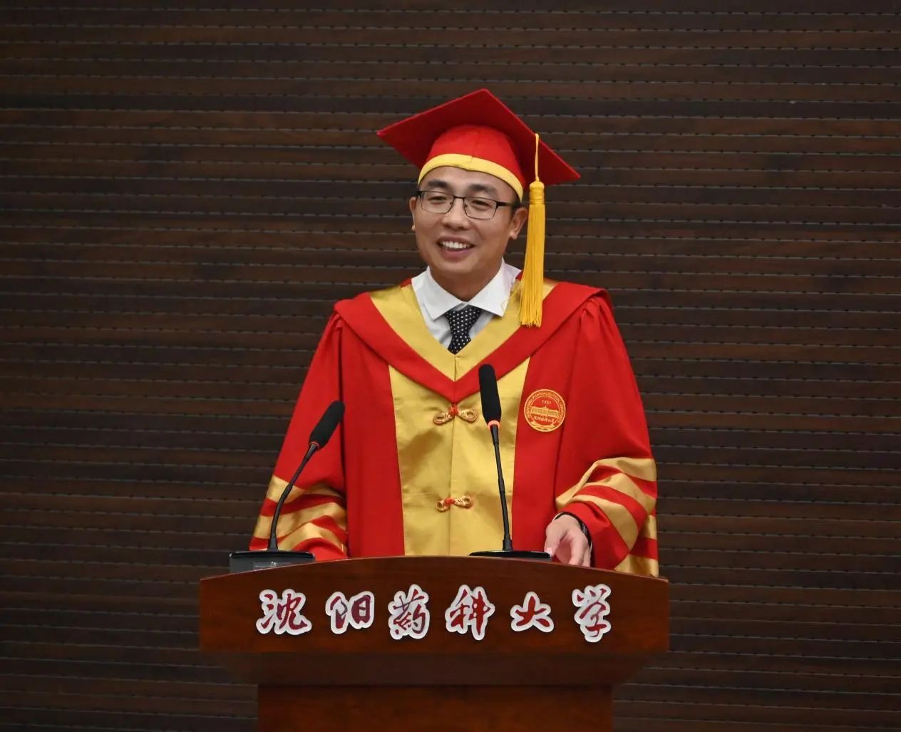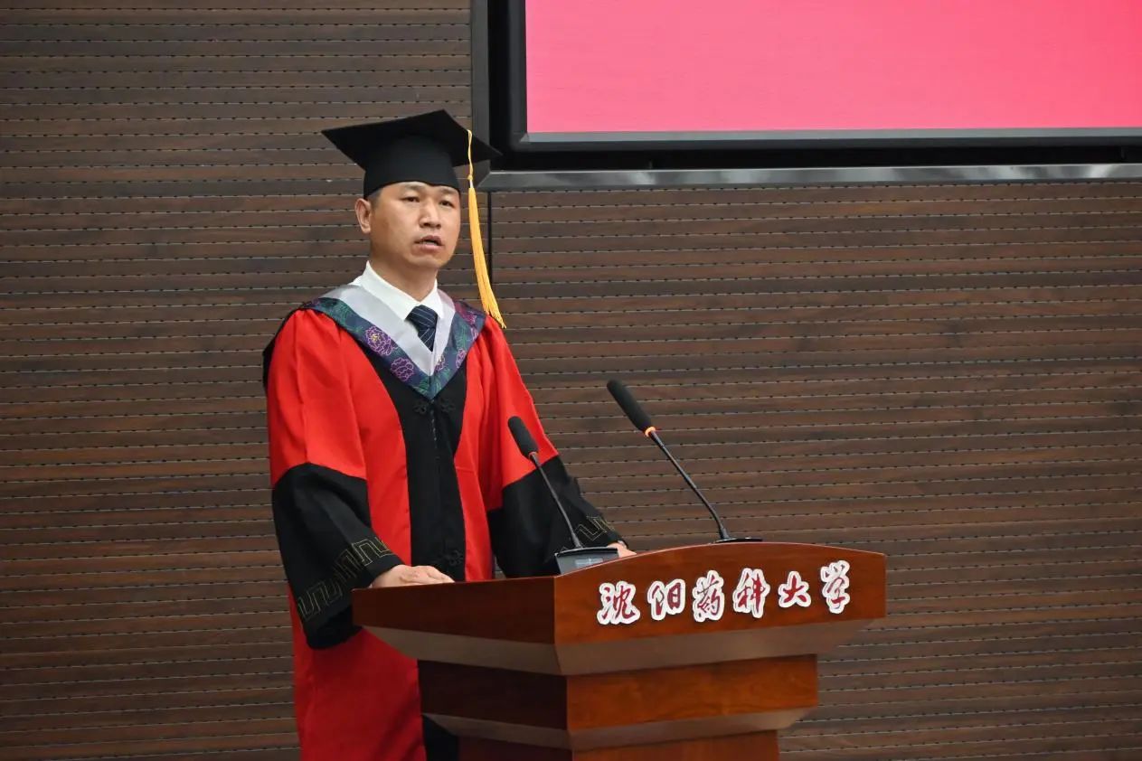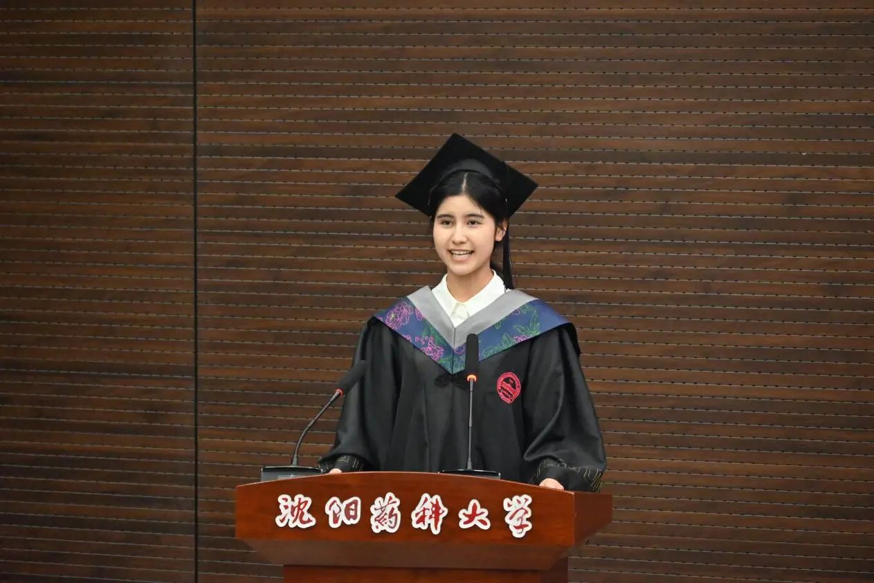 88期医疗产品管理专业法茹扎・艾则孜作为学生代表发言,她回顾大学时光,表达对父母、学院和母校的感恩之情与对未来的憧憬,并郑重承诺会用实际行动传承沈药红色基因,弘扬“坚忍不拔、药济天下”的沈药传承,以青春之我、奋斗之我,为器械行业、药学事业发展架桥铺路,为母校发展增砖添瓦。