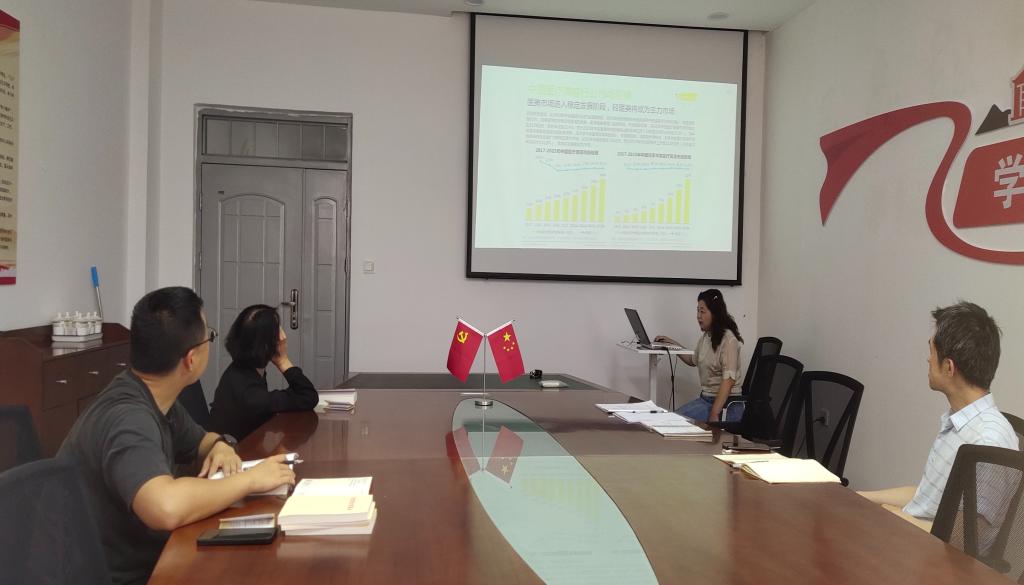 支部党员以医疗美容行业发展为主题,重点就当前医疗美容定义、医疗美容项目分类、行业市场规模、产业链情况及主流产品等情况进行了充分交流,并结合自身研究方向,就医美器械市场开拓及促进学院高质量发展进行交流研讨。