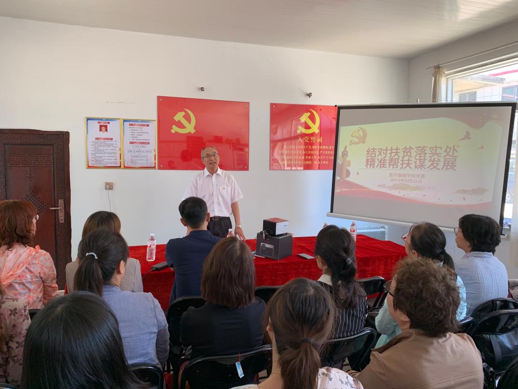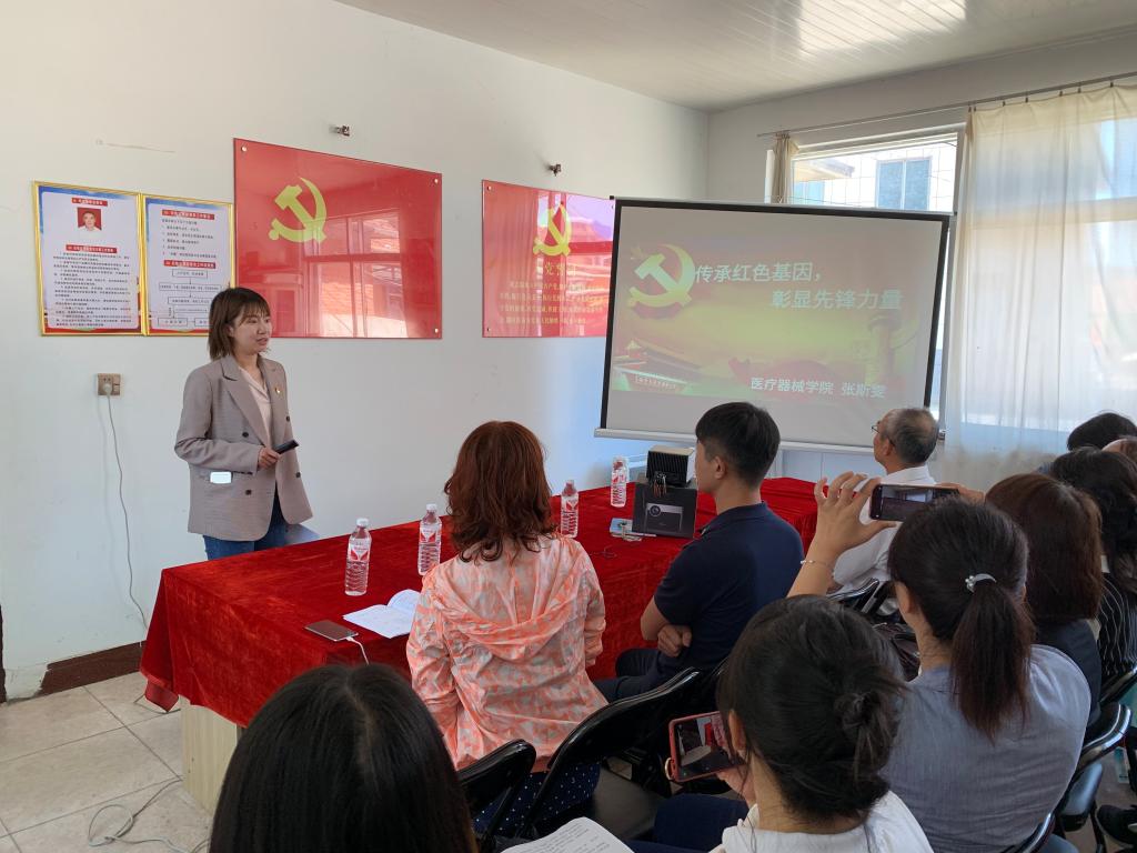 学院党委书记李鸿滨、副院长崔勇代表学院领导班子为张斯雯同志送去了慰问品。张斯雯同志为全体党员做《传承红色基因,彰显先锋力量》主题党课,她以实际驻村工作和国家扶贫政策为出发点,从自身的思想意识转变与成长、驻村扶贫工作的开展与成效等方面内容,为全体党员介绍扶贫经历和心路历程,展现了沈药青年教师对国家和社会的一份责任与担当。随后张斯雯领誓,全体党员重温入党誓词,青年党员张晓帆代表全体党员表态发言。李鸿滨书记在总结中讲道,张斯雯同志在一年多驻村工作中,克服诸多令人难以想象困难,圆满完成驻村扶贫工作任务,为当地引进扶贫资金100万项目做出突出贡献,受到村干部高度好评和认可,她用自己的实际行动,践行总书记精准扶贫的号召,是年轻党员学习的榜样,全体党员要学习张斯雯同志勇于奉献、吃苦耐劳、服务农村、贴近农民的精神和模范事迹,立足本职工作,不忘初心、牢记使命、扎实工作、立德树人,自觉发挥党员先锋模范作用,传承红色基因,共筑沈药梦想,在平凡的工作中,做出不平凡的事迹,以优异的成绩迎接建国70周年。
