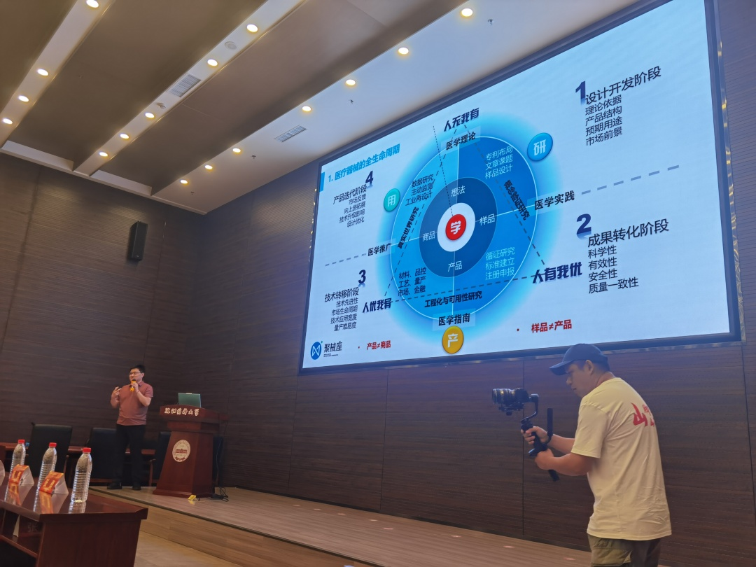 随后,庞大海副处长带来了精彩的医疗器械安全知识讲座。他详细阐述了医疗器械的定义、分类标准、各类器械的特点及应用领域,介绍了医疗器械法规管理概况、目前国内医疗器械监管的构架、组成等知识,为大学生的职业规划提供了有益参考。