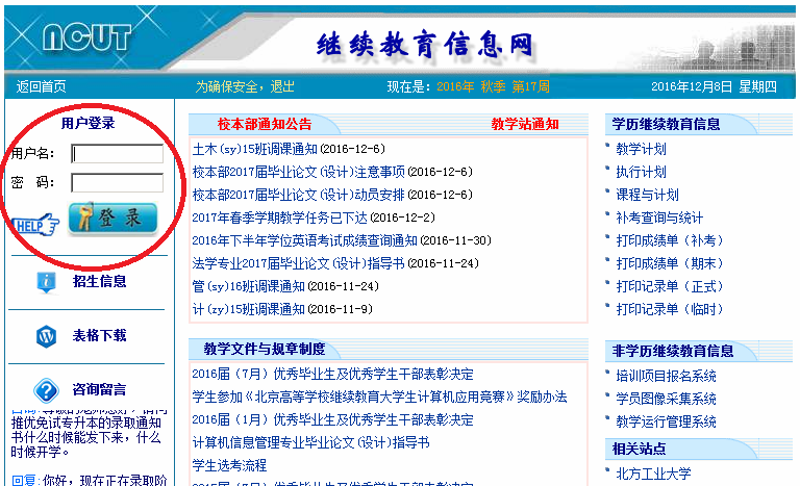 一、特别提示:继续教育信息网(http://jjxx.ncut.edu.cn/)是pp电子教学综合服务平台,登陆个人账号,可查询在校期间教学通知、学期课表、考试安排、课程成绩、注册缴费、学籍变动、学业审核等各种信息。请大家登陆后首先修改密码,并妥善保管!