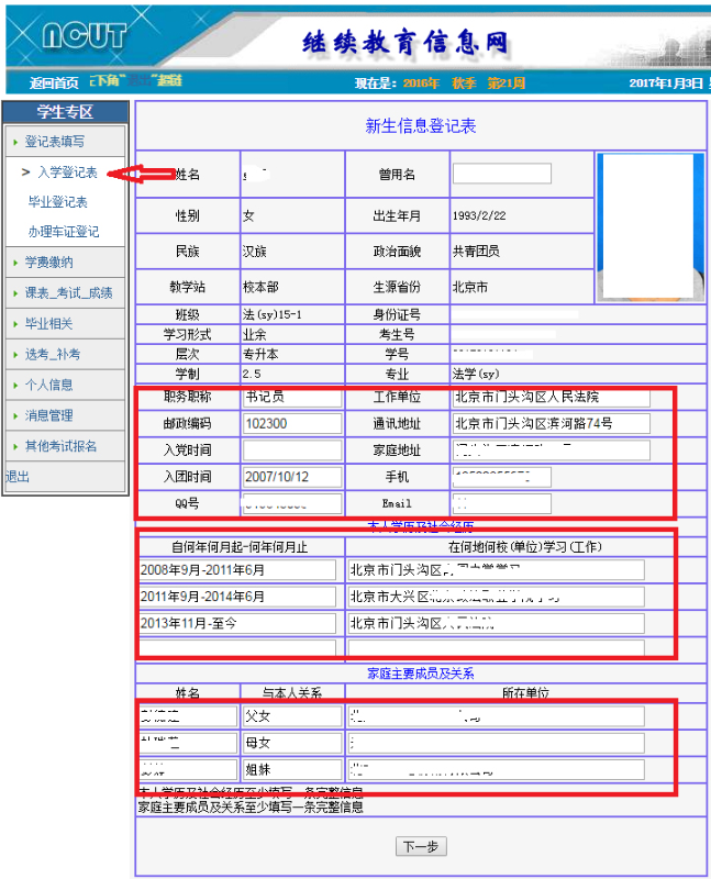 填写要尽量完整详细,将作为学籍档案保存,“本人学历及社会经历”和“家庭主要成员及关系”项,必须填写完整。
